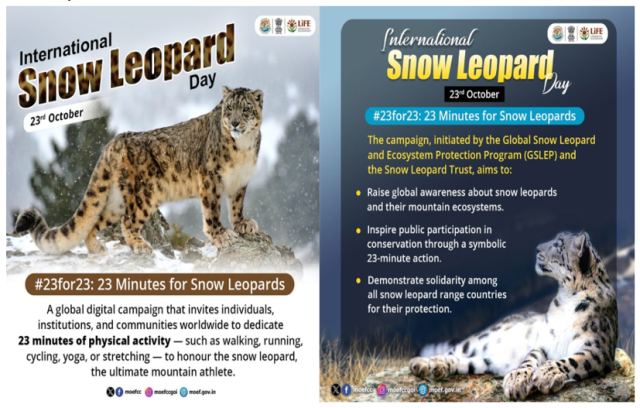 भारत ने ‘#23for23’ पहल के साथ अंतर्राष्ट्रीय हिम तेंदुआ दिवस मनाया, जिसमें नागरिकों को हिम तेंदुओं और उनके संवेदनशील पर्वतीय आवासों के संरक्षण के बारे में जागरूकता बढ़ाने के लिए 23 मिनट की शारीरिक गतिविधि समर्पित करने के लिए प्रोत्साहित किया गया।