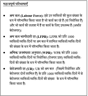 • श्रम-बाजार की स्थितियों में सुधार के प्रमाण: श्रम बल भागीदारी दर (LFPR) और श्रमिक जनसंख्या अनुपात (WPR) में वृद्धि के साथ-साथ बेरोजगारी दर (UR) में गिरावट, रोजगार अवशोषण में सुधार का संकेत देती है, विशेष रूप से ग्रामीण क्षेत्रों और महिलाओं में।