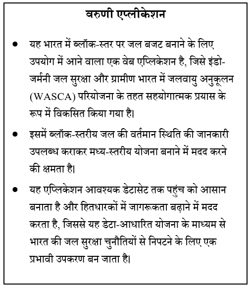 • वरुणी जल बजट एप्लिकेशन को भारत के विभिन्न राज्य/कृषि-जलवायु क्षेत्रों के 18 आकांक्षी ब्लॉकों में पायलट किया गया।