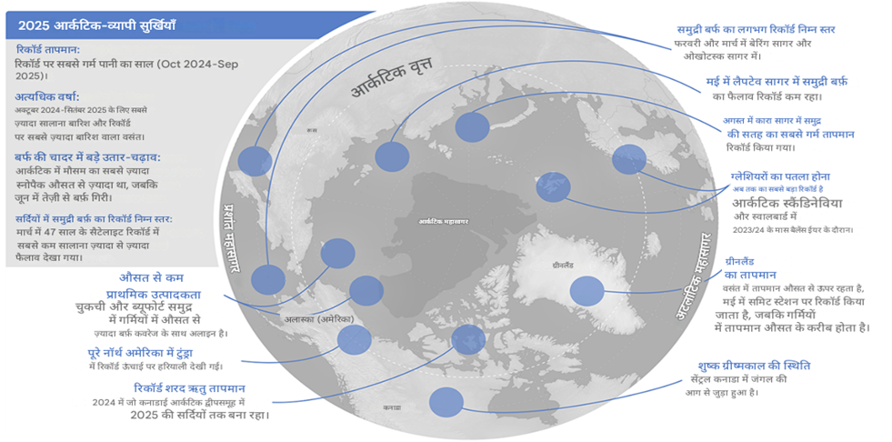 - अक्टूबर 2024 से सितंबर 2025 की अवधि के दौरान आर्कटिक क्षेत्र में 1900 के बाद से अब तक का सबसे अधिक सतही वायु तापमान दर्ज किया गया।