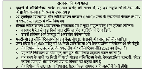 - निवेश क्षमता: इससे प्रमुख घरेलू और वैश्विक निवेशकों, लॉजिस्टिक्स प्रौद्योगिकी प्रदाताओं तथा वेयरहाउसिंग ऑपरेटरों को आकर्षित करने की भी उम्मीद है, जिससे उत्तर प्रदेश भारत के व्यापार गलियारे नेटवर्क में एक महत्वपूर्ण खिलाड़ी के रूप में स्थापित होगा।