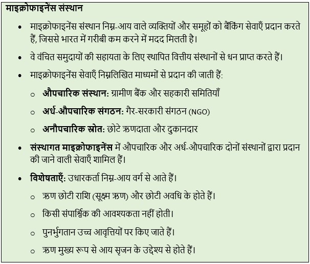 - 30 सितंबर, 2025 को समाप्त तिमाही में, माइक्रोफाइनेंस संस्थानों (MFI) ने लगभग 4% की वृद्धि दर्ज की, जिसमें तिमाही ऋण राशि ₹7,258 करोड़ थी।