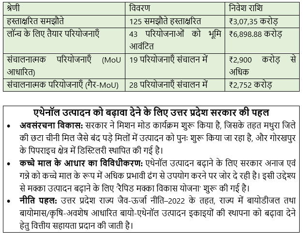 - वर्तमान में प्रदेश में 125 निवेश समझौते किए गए हैं, साथ ही 43 परियोजनाएँ लॉन्च के लिए तैयार हैं और 19 परियोजनाएँ इन्वेस्ट यूपी पहल के तहत चल रही हैं, जो मिलकर 4,800 से अधिक रोजगार अवसर उत्पन्न करने का अनुमान है।