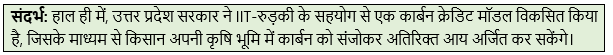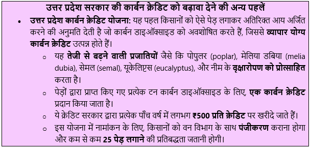 - कार्बन क्रेडिट मैकेनिज़्म: किसान कार्बन उत्सर्जन में कमी करने पर कार्बन क्रेडिट कमाएंगे, क्योंकि उनकी भूमि पर लगाए गए पेड़ प्रकाश-संश्लेषण की प्रक्रिया के लिए वायुमंडल से लगातार कार्बन डाइऑक्साइड अवशोषित करते हैं।