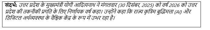- उत्तर प्रदेश आर्टिफिशियल इंटेलिजेंस, डेटा सेंटर और रोबोटिक्स तथा ड्रोन सिस्टम जैसी अत्याधुनिक तकनीकों के एक प्रमुख केंद्र के रूप में उभर रहा है।