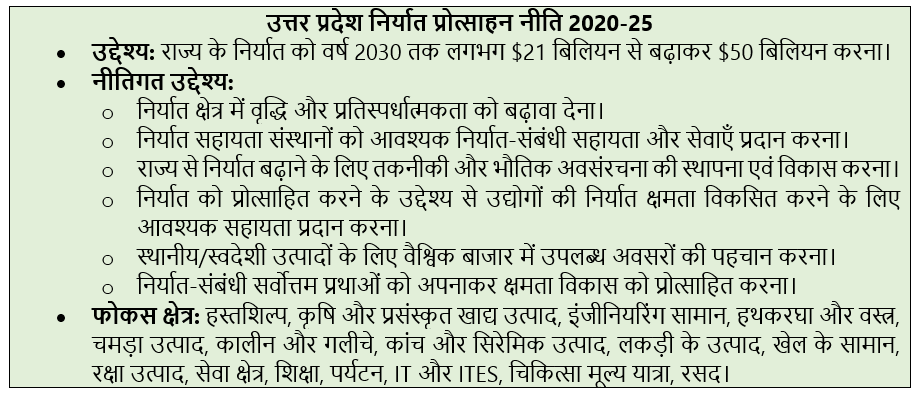 हाल ही में, उत्तर प्रदेश सरकार ने राज्य के निर्यात विकास को बढ़ावा देने के उद्देश्य से उत्तर प्रदेश निर्यात संवर्धन नीति 2025-30 के तहत निर्यातकों के लिए वित्तीय प्रोत्साहनों को मंजूरी दी है।