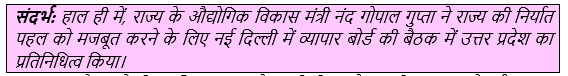 संदर्भ: हालही में, राज्य के औद्योगिक विकास मंत्री नंद गोपाल गुप्ता ने राज्य की निर्यात पहल को मजबूत करने के लिए नई दिल्ली में व्यापार बोर्ड की बैठक में उत्तर प्रदेश का प्रतिनिधित्व किया।