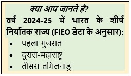 राज्य रैंकिंग: FIEO (फेडरेशन ऑफ इंडियन एक्सपोर्ट ऑर्गनाइजेशन) के अनुसार, उत्तर प्रदेश ने वर्ष 2024-25 में भारत के कुल निर्यात अर्थात् ₹37.02 लाख करोड़ में ₹1.86 लाख करोड़ का योगदान दिया, जो शीर्ष निर्यातक राज्यों में पांचवें स्थान पर रहा।