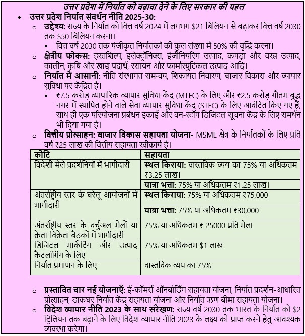 उत्तर प्रदेश में निर्यात वृद्धि: उत्तर प्रदेश का निर्यात वर्ष 2018 में ₹84,000 करोड़ से बढ़कर वर्ष 2024-25 में ₹1.86 लाख करोड़ हो गया है।