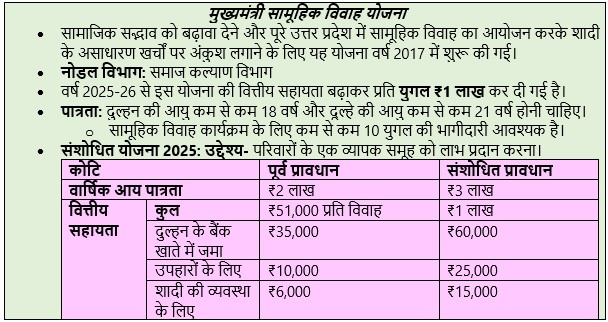 - इस योजना का उद्देश्य आर्थिक रूप से कमजोर वर्गों के विवाह का समर्थन करते हुए सामुदायिक सहयोग को मजबूत करना और महिलाओं की गरिमा को बनाए रखना है।