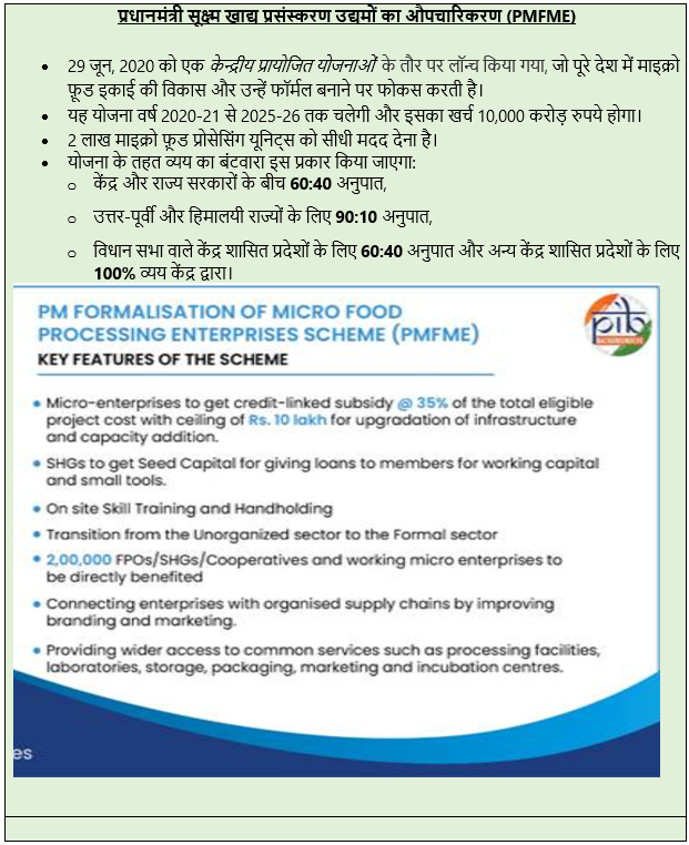 संदर्भ: उत्तर प्रदेश प्रधानमंत्री सूक्ष्म खाद्य प्रसंस्करण उद्यमों का औपचारिकीकरण (PMFME) योजना के कार्यान्वयन में शीर्ष प्रदर्शन करने वाला राज्य बन गया है, जो राज्य के खाद्य प्रसंस्करण क्षेत्र के लिए एक महत्वपूर्ण उपलब्धि है।