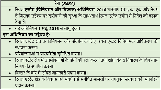 संदर्भ: हाल ही में, उत्तर प्रदेश रियल एस्टेट विनियामक प्राधिकरण (UP RERA) ने अपनी 186वीं बैठक के दौरान छह नई रियल एस्टेट परियोजनाओं को मंजूरी दी।