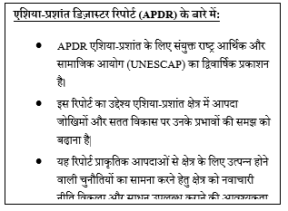 - बढ़ते तापमान के कारण, एशिया-प्रशांत क्षेत्र में बाढ़, तूफान, सूखा, मरुस्थलीकरण और रेत/धूल भरी आंधी जैसी आपदाओं का खतरा लगातार बढ़ रहा है जबकि अत्यधिक गर्मी को सबसे तेज़ी से उभरते खतरे के रूप में देखा जा रहा है।