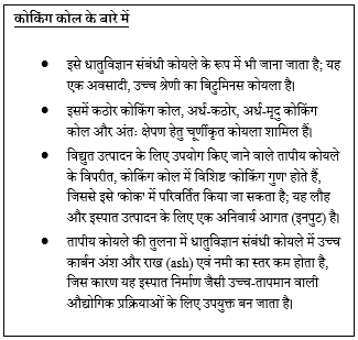 - भारत के पास लगभग 37.37 बिलियन टन कोकिंग कोल संसाधन हैं, फिर भी इस्पात क्षेत्र की लगभग 95% आवश्यकताओं की पूर्ति आयात के माध्यम से की जाती है।