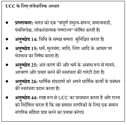 - भारतीय संविधान का अनुच्छेद 44 समान नागरिक संहिता का प्रावधान करता है, जो राज्य के नीति निर्देशक तत्वों (DPSP) का एक हिस्सा है। यह देश भर में सभी नागरिकों पर लागू होने वाले नागरिक कानूनों के एक समान सेट की स्थापना पर बल देता है।