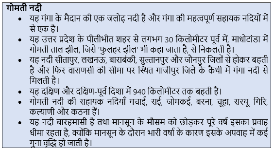 संदर्भ: मुख्यमंत्री योगी आदित्यनाथ ने 13 अक्टूबर, 2025 को गोमती नदी के अविरल प्रवाह के लिए ‘गोमती पुनरुद्धार मिशन’ की घोषणा की, जिसका महत्वाकांक्षी लक्ष्य इस नदी में गिरने वाले 95 प्रतिशत शहरी सीवेज को रोकना है।