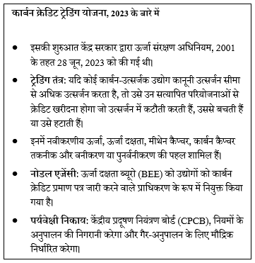 - इन नियमों को कार्बन क्रेडिट ट्रेडिंग योजना, 2023 के अनुपालन तंत्र के तहत अधिसूचित किया गया है।