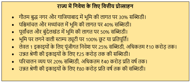 - प्रतिभाओं को पोषित करने और कौशल संवर्धन, अनुसंधान एवं नवाचार के साथ-साथ मामला-दर मामला आधार पर विशेष प्रोत्साहन भी प्रदान किए जाएंगे, जो उत्तर प्रदेश को वैश्विक सेवा और नवाचार केंद्र के रूप में उभरने में मदद करेंगे।