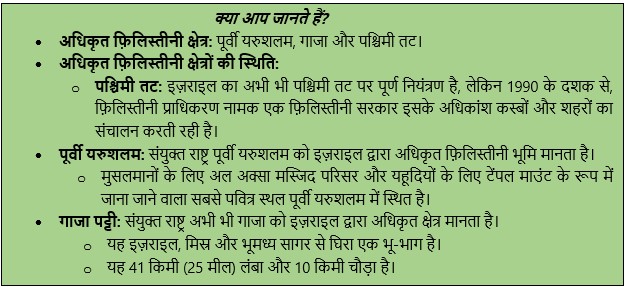 - समझौतों के तहत मिस्र ने गाजा पट्टी पर, जॉर्डन ने पश्चिमी तट और पूर्वी यरुशलम पर तथा इज़राइल ने पश्चिमी यरुशलम पर कब्ज़ा कर लिया।
