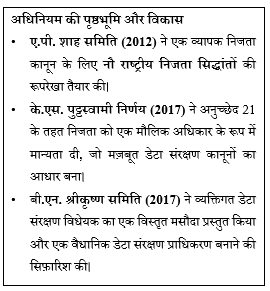 - यह ऐसा कानूनी ढाँचा स्थापित करता है जो व्यक्तियों के डेटा संरक्षण के अधिकार को स्वीकार करता है, साथ ही संगठनों को वैध उद्देश्यों के लिए डेटा प्रोसेस करने की आवश्यकता को भी मान्यता देता है।