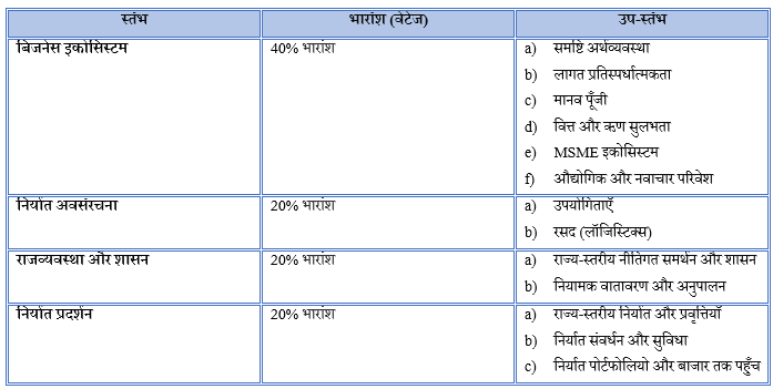 • संकेतकों को उचित सांख्यिकीय तकनीकों का उपयोग करके सामान्यीकृत और एकीकृत किया गया है। निर्यात तैयारी में उनके सापेक्ष योगदान को दर्शाने के लिए विभिन्न स्तंभों और उप-स्तंभों को संतुलित भारांश (Weightages) दिए गए हैं।