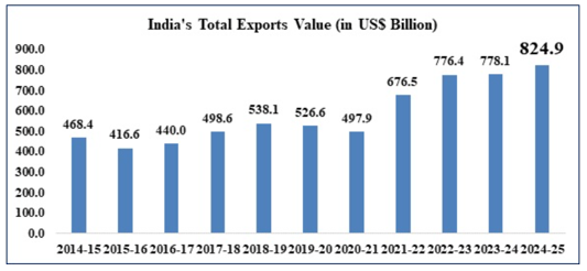 • यह पिछले वर्ष के 778.1 बिलियन अमेरिकी डॉलर के निर्यात आंकड़े की तुलना में 6.01% की वृद्धि का संकेत है, जो देश के व्यापार प्रक्षेपवक्र में एक नई उपलब्धि है।