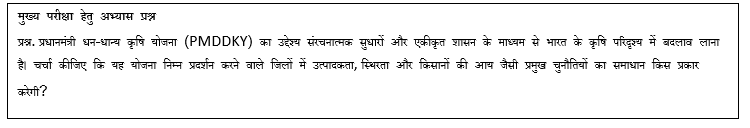 - PMDDKY एक प्रमुख कृषि सुधार पहल है जिसका उद्देश्य भारतीय कृषि में उत्पादकता, स्थिरता और लाभप्रदता में सुधार करना है।