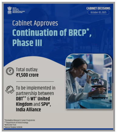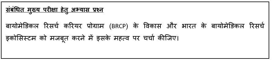 हाल ही में, केंद्रीय मंत्रिमंडल ने भारत के जैव चिकित्सा अनुसंधान इकोसिस्टम को मजबूती प्रदान करने के लिए बायोमेडिकल रिसर्च करियर प्रोग्राम (BRCP) के तीसरे चरण को मंजूरी दी।