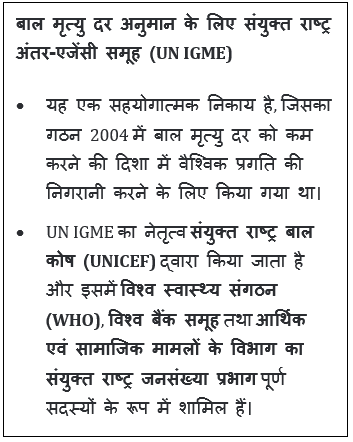 संदर्भ: हाल ही में, ‘बाल मृत्यु दर अनुमान के लिए संयुक्त राष्ट्र अंतर-एजेंसी समूह‘ (UN IGME) ने ‘बाल मृत्यु दर में स्तर और रुझान‘ शीर्षक से एक रिपोर्ट जारी की है।यह रिपोर्ट वैश्विक स्तर पर पांच वर्ष से कम उम्र के बच्चों की मृत्यु दर, नवजात मृत्यु दर और बच्चों के जीवित रहने की संभावनाओं (child survival) से जुड़े रुझानों पर प्रकाश डालती है।