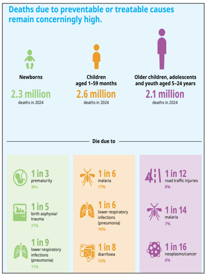 - वर्ष 2024 में पांच वर्ष से कम उम्र के लगभग 49 लाख बच्चों की मृत्यु हुई, जिनमें से अधिकांश मौतें रोकथाम योग्य कारणों से हुईं।