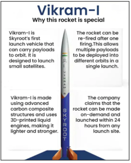 • प्रधानमंत्री ने स्काईरूट के पहले कक्षीय रॉकेट ‘विक्रम-1’ का भी अनावरण किया। इसमें उपग्रहों को कक्षा में स्थापित करने की क्षमता है।