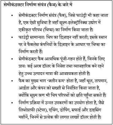 •  वैश्विक मूल्य शृंखलाओं (GVCs) में एकीकरण: यह फैब, एटीएमपी/ओसैट इकाइयों (जैसे माइक्रोन सेमीकंडक्टर टेक्नोलॉजी इंडिया प्रा. लि.) के साथ मिलकर भारत को वैश्विक सेमीकंडक्टर आपूर्ति शृंखला में एक विश्वसनीय केंद्र के रूप में स्थापित करता है, जो पूर्वी एशिया और अमेरिका के केंद्रों का पूरक है।
