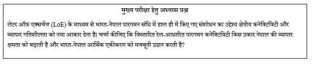 - इस समझौते से नेपाल के रेल-आधारित पारगमन विकल्प का विस्तार होगा और बीरगंज आईसीपी पर निर्भरता और भीड़भाड़ कम होगी।