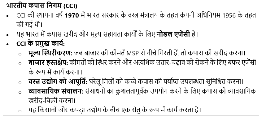 संदर्भ: हाल ही में, आर्थिक मामलों की मंत्रिमंडलीय समिति (CCEA) ने कपास सीजन 2023-24 के लिए भारतीय कपास निगम (CCI) को ₹1,718.56 करोड़ के न्यूनतम समर्थन मूल्य (MSP) वित्तपोषण को मंजूरी दी है।