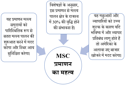 • MSC प्रमाणन एक अंतरराष्ट्रीय स्तर पर मान्यता प्राप्त पारिस्थितिक लेबल है, जो प्राकृतिक मत्स्य संसाधनों से सतत रूप से प्राप्त समुद्री खाद्य पदार्थों के लिए दिया जाता है। यह सुनिश्चित करता है कि मछली भंडार स्वस्थ हों, पर्यावरणीय प्रभाव न्यूनतम हों, और मत्स्य पालन का प्रबंधन सुव्यवस्थित हो।