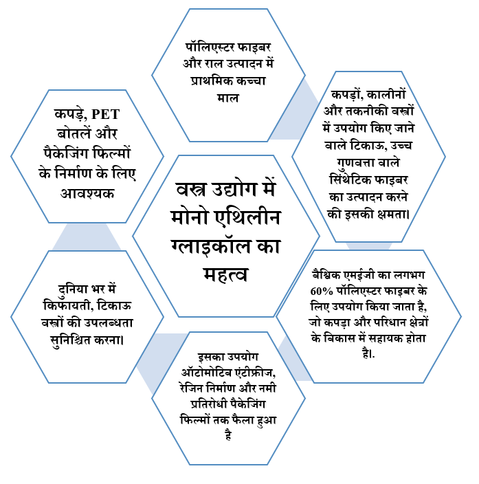 वस्त्र उद्योग ने सरकार से मोनो एथिलीन ग्लाइकॉल (MEG) पर एंटी-डंपिंग शुल्क न लगाने की अपील की है। यह पॉलिएस्टर फाइबर और फिलामेंट के उत्पादन में उपयोग किए जाने वाले मुख्य कच्चे माल में से एक है।