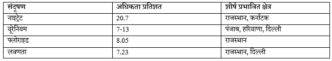 - यूरेनियम: पंजाब (मानसून के बाद 62.5%), हरियाणा (40-50%), दिल्ली (13-15%) में उच्च स्तर जिसका कारण भूगर्भीय गतिविधि और भूजल का अत्यधिक निष्कर्षण है।