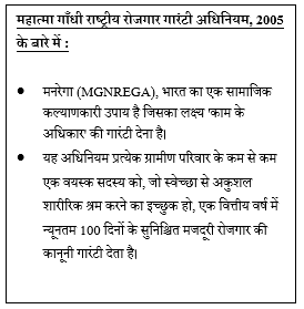 - रोजगार की गारंटी: यह योजना उन वयस्कों के लिए, जो अकुशल शारीरिक श्रम हेतु स्वेच्छा से आगे आते हैं, प्रति ग्रामीण परिवार वैधानिक मजदूरी रोजगार की गारंटी को प्रति वित्तीय वर्ष 100 दिनों से बढ़ाकर 125 दिन करती है।