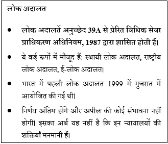 - न्यायिक निपटान/लोक अदालत: औपचारिक न्यायालय प्रणाली के बाहर विवादों के सौहार्दपूर्ण समाधान के लिए भारत में स्थापित एक तंत्र।