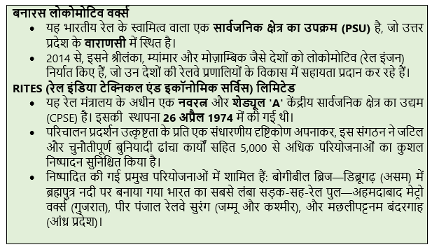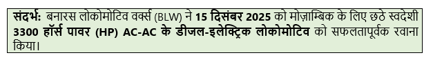 - यह उपलब्धि वाराणसी को रेलवे लोकोमोटिव निर्यात हब के रूप में स्थापित करने की दिशा में एक महत्वपूर्ण कदम है और वैश्विक रेलवे क्षेत्र में भारत के बढ़ते प्रभाव को रेखांकित करती है।