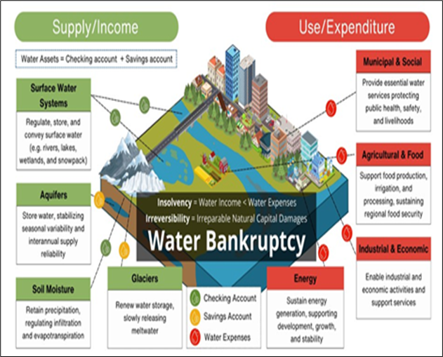 - वॉटर बैंकरप्सी ‘संकट के बाद की एक स्थायी’ अवस्था है जहाँ किसी क्षेत्र का दीर्घकालिक जल उपयोग उसकी नवीकरणीय आपूर्ति से अधिक हो जाता है, जिससे प्राकृतिक जल प्रणालियों को अपरिवर्तनीय क्षति पहुँचती है।