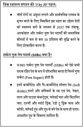 • उल्लेखनीय है कि WHO ने देशों से शर्करा युक्त पेय का उपभोग कम करने और स्वास्थ्य परिणामों में सुधार लाने हेतु अपनी नई ‘3 by 35’ पहल के हिस्से के रूप में करों को बढ़ाने और पुनः डिज़ाइन करने का आह्वान किया है।