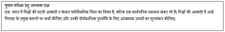- पतली-चोंच वाले गिद्ध के सभी 47 ऐतिहासिक प्रजनन स्थल नष्ट हो चुके हैं और यह अब ऊपरी असम में केवल 12 नए पाए गए स्थानों पर ही प्रजनन करता है।