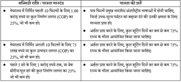 • मेघालय में अपने 75% कंटेंट की शूटिंग करने वाली फिल्में 1 करोड़ रुपये तक की वित्तीय सहायता के लिए पात्र हैं।