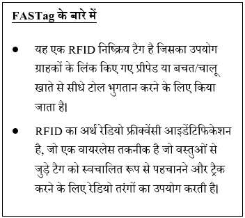 • वर्तमान में, लगभग 98% टोल भुगतान फास्टैग के माध्यम से किए जाते हैं, जबकि 2% के लिए अभी भी नकद में भुगतान किया जाता है, जो आगे डिजिटल समावेशन की गुंजाइश को दर्शाता है।