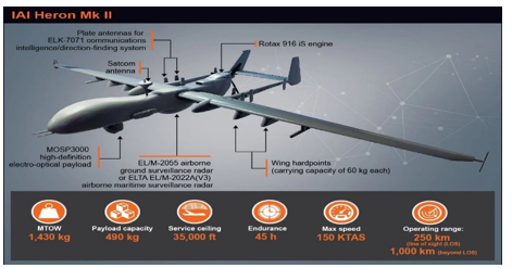 - हेरॉन MK II एक मीडियम एल्टीट्यूड लॉन्ग एंड्यूरेंस (MALE) मानव रहित हवाई यान (UAV) है।