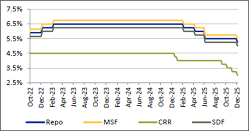 संदर्भ: मौद्रिक नीति समिति (MPC) ने दिसंबर 2025 में पॉलिसी रेपो दर को 25 आधार अंकों से घटाकर 5.25 प्रतिशत कर दिया है।