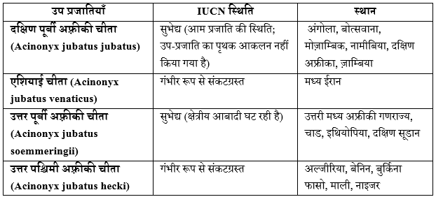 - चीता जीनस Acinonyx की एकमात्र जीवित प्रजाति है। मूल रूप से, चीतों की पाँच उप-प्रजातियों को मान्यता दी गई थी, लेकिन हाल के आनुवंशिक अध्ययनों से पता चलता है कि केवल चार उप-प्रजातियों को ही मान्यता दी जा सकती है: