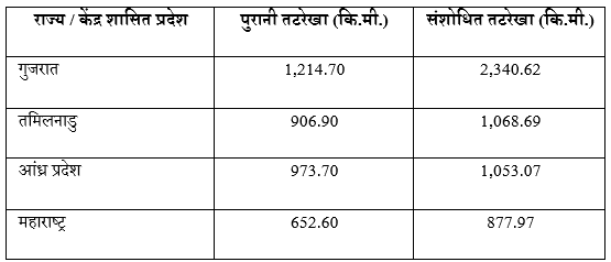- संशोधित तटरेखा की लंबाई तटीय विनियमन क्षेत्र (CRZ) विनियमों के अंतर्गत आने वाले क्षेत्रों को प्रभावित नहीं करती है, क्योंकि CRZ सीमाएँ केवल सतत तटीय प्रबंधन के लिए राष्ट्रीय केंद्र (NCSCM) द्वारा सीमांकित वास्तविक उच्च ज्वार रेखा (High Tide Line – HTL) के आधार पर निर्धारित की जाती हैं।
