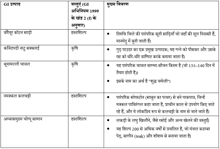 - तमिलनाडु के उत्पाद जिन्हें दिसंबर 2025 में हाल ही में जीआई टैग प्राप्त हुआ है: